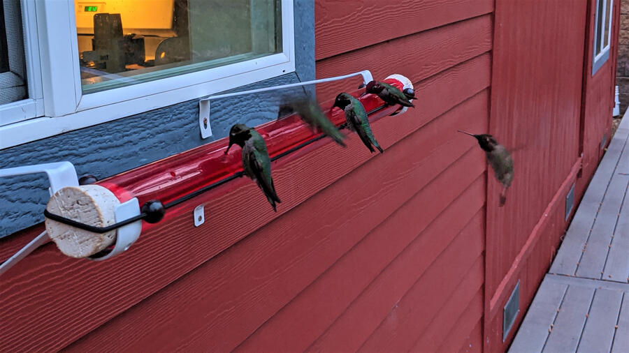 Trying to tempt them to my hand - no luck. They much preferred the feeder. Look for the single Rufus Hummingbird joining the party. He's the "orange" one. (The above videos were taken roughly one year apart. And again, a single Rufus in the mix. I wonder if it's the same little guy????)